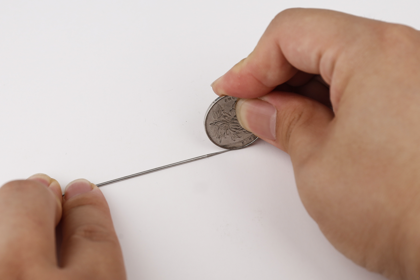 Place the bent needle on the flat surface, Using the flat part of the nickel, gently roll it along the length of the needle, applying light pressure. This rolling motion helps to identify any remaining bends in the needle.