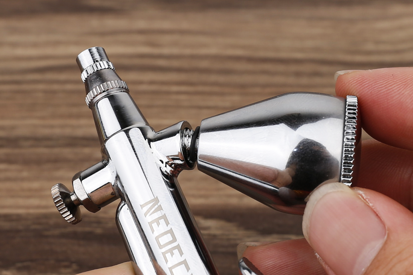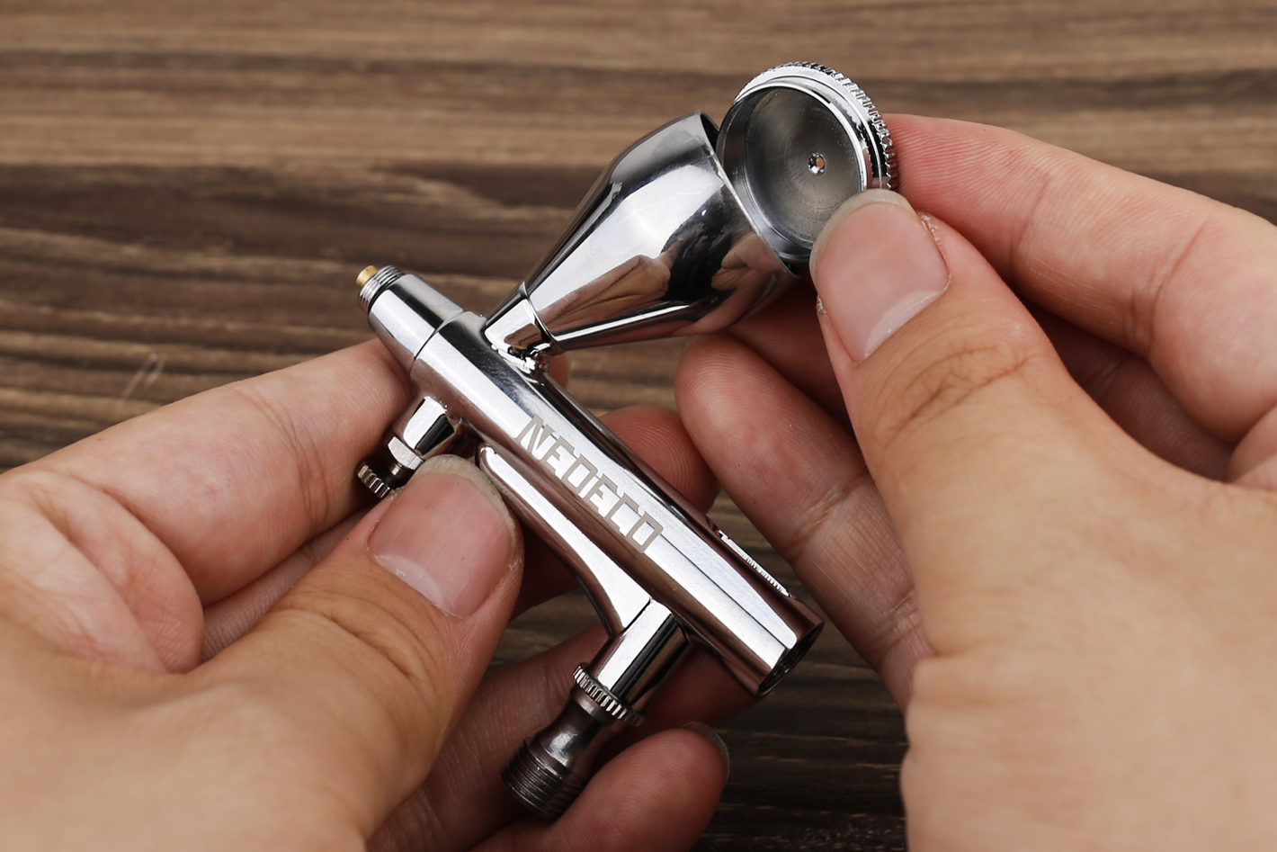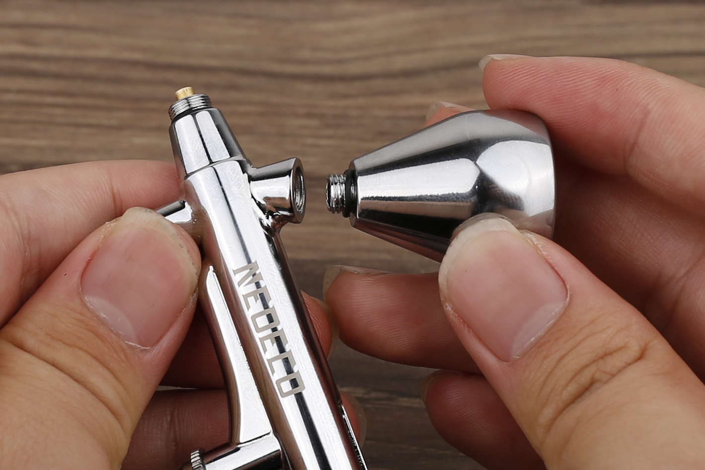 Screw the airbrush cup onto the airbrush body, tightening it securely to prevent any leakage.
