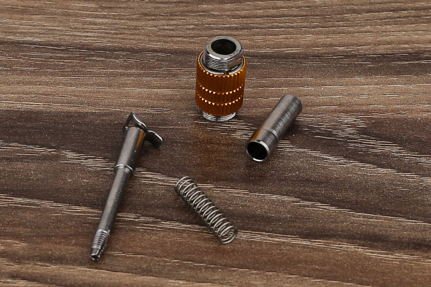 To prepare the parts for cleaning, place them adjacent to each other, ensuring they are organized and readily accessible.Remove the airbrush lever, gently extract it from its position, ensuring a careful and controlled grasp to avoid any potential damage or misalignment.