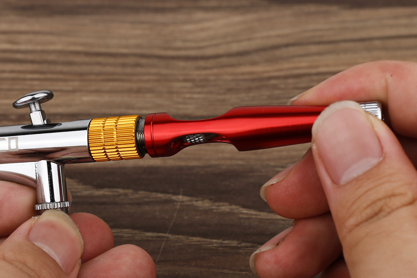 Twist and tighten the airbrush handle by turning it in a clockwise direction until it is securely screwed in place.