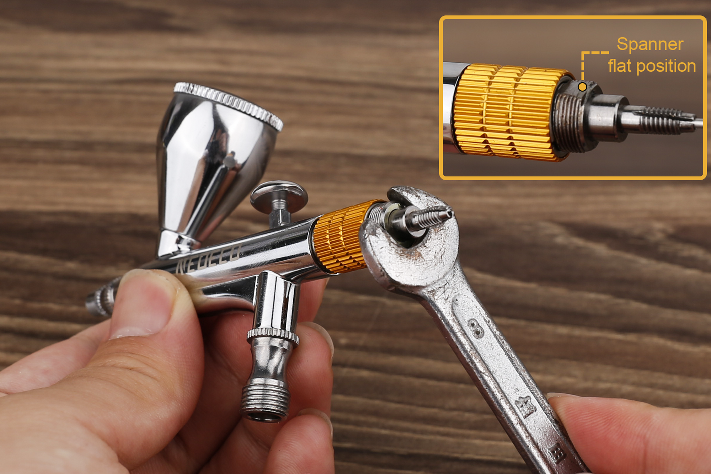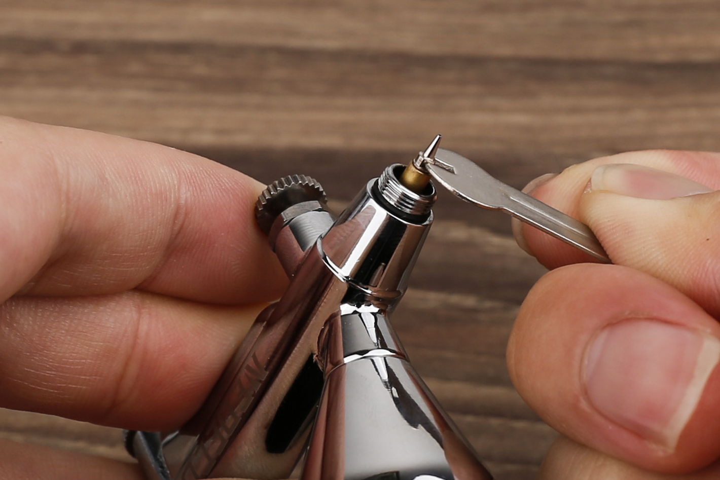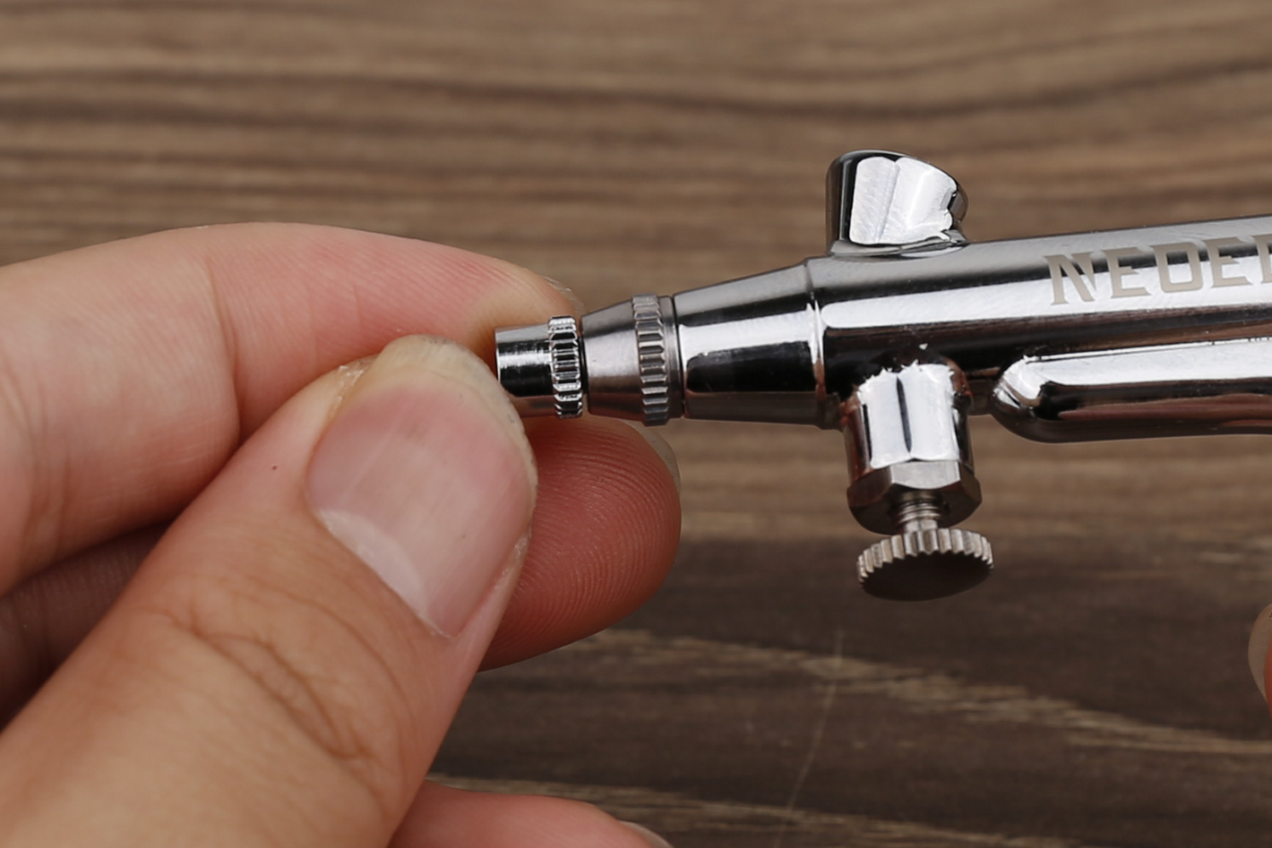 Carefully turn the airbrush needle nut in a counterclockwise direction until it loosens and can be taken out.