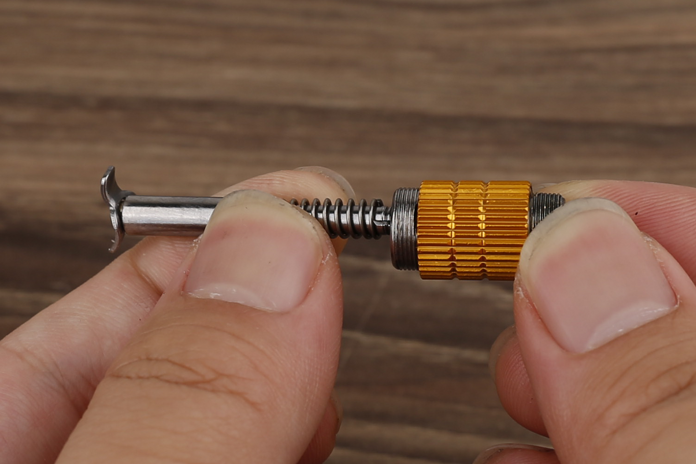 Position the spring case in such a way that the grooves or notches on the case match with the corresponding slots or ridges on the needle chucking.
