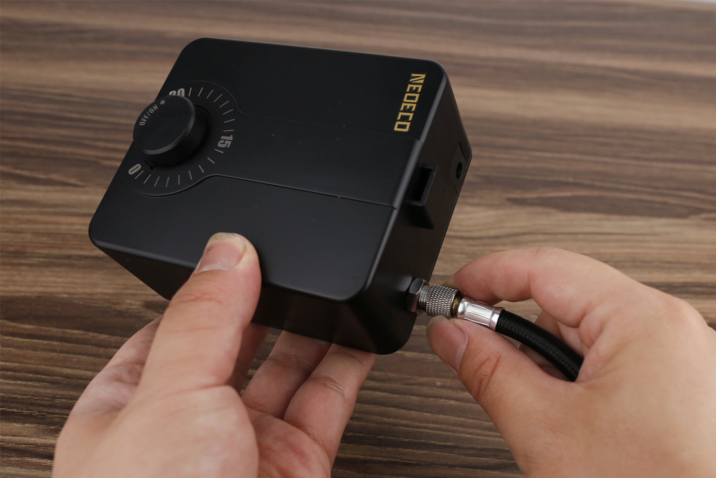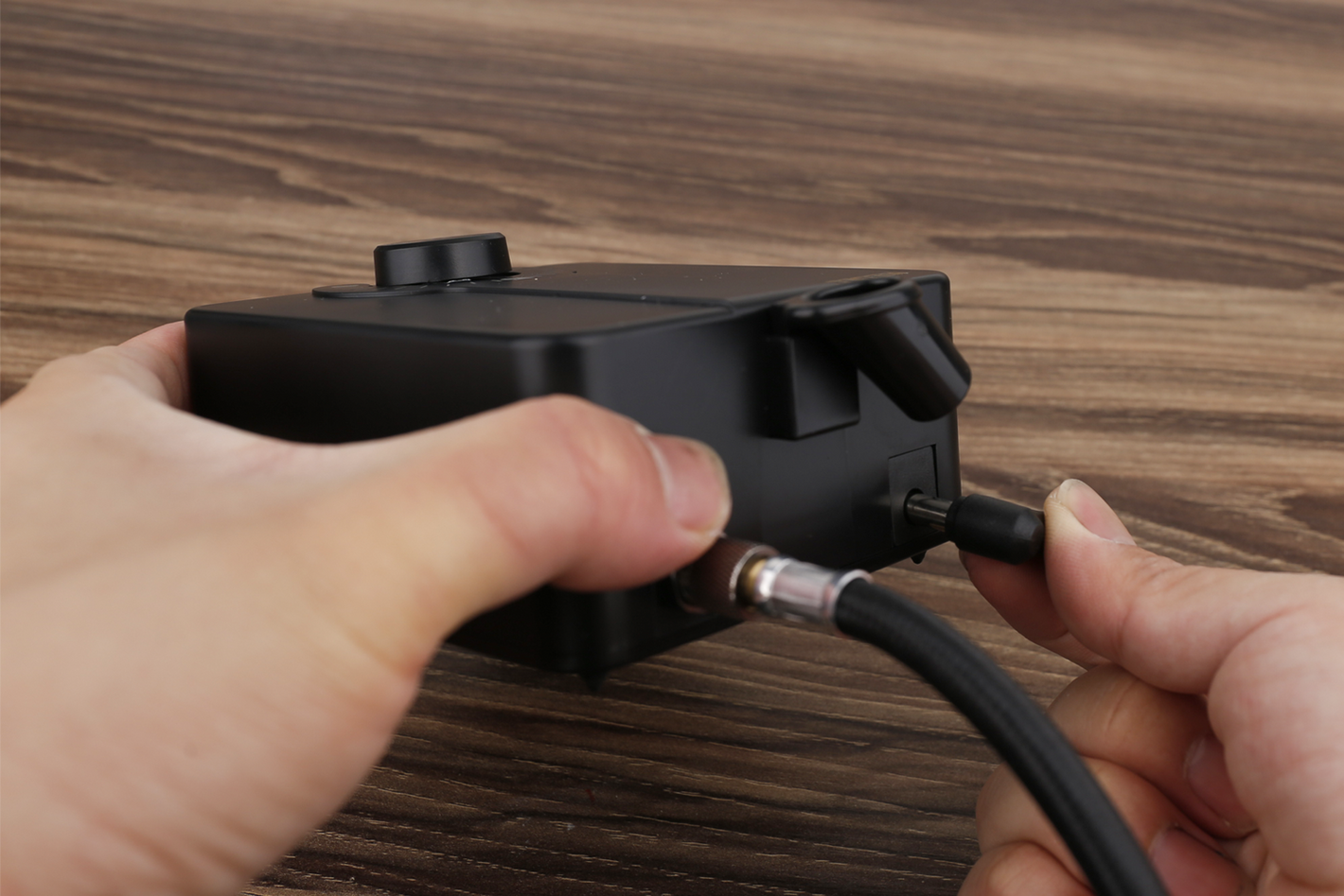 Align and plug the small end of the adapter onto the hole on the compressor and plug in the adaptor.