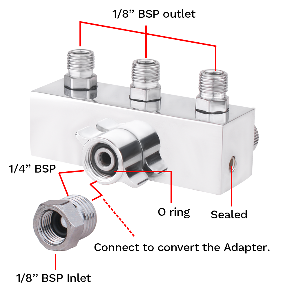 - Includes a 1/4'' BSP female inlet and 3/4/5 - 1/8'' BSP male outlets that allow you to split your air supply up to several ways