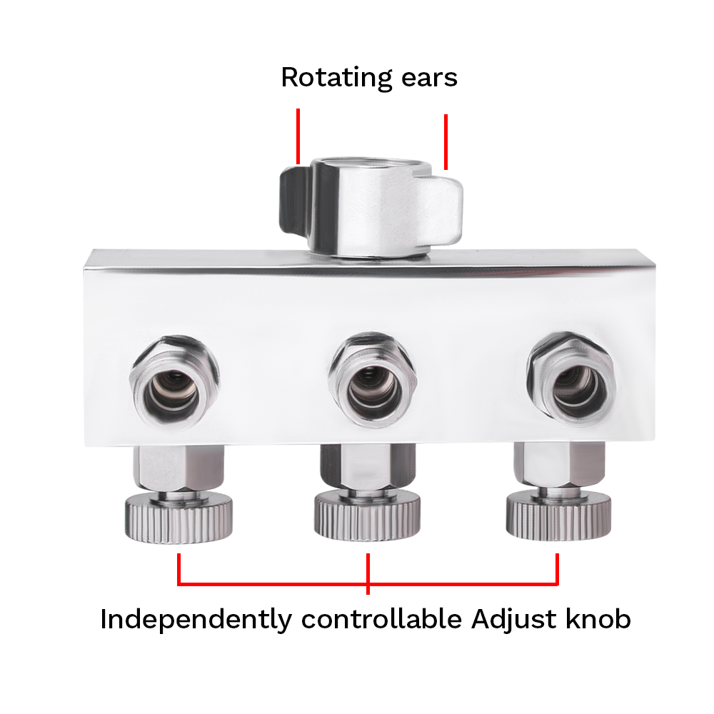 - Each air outlet has its own air regulation valve knob to customize the pressure to each of the hose splitters