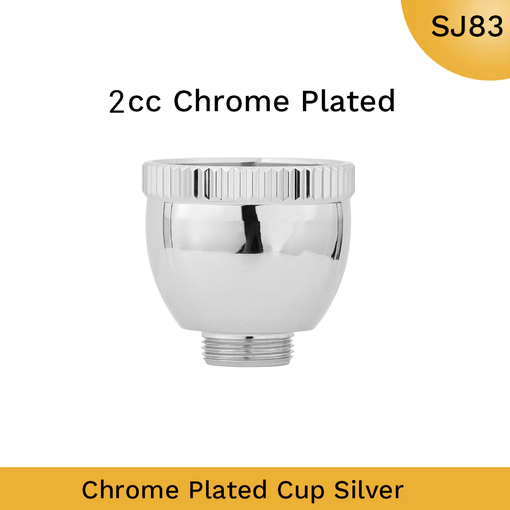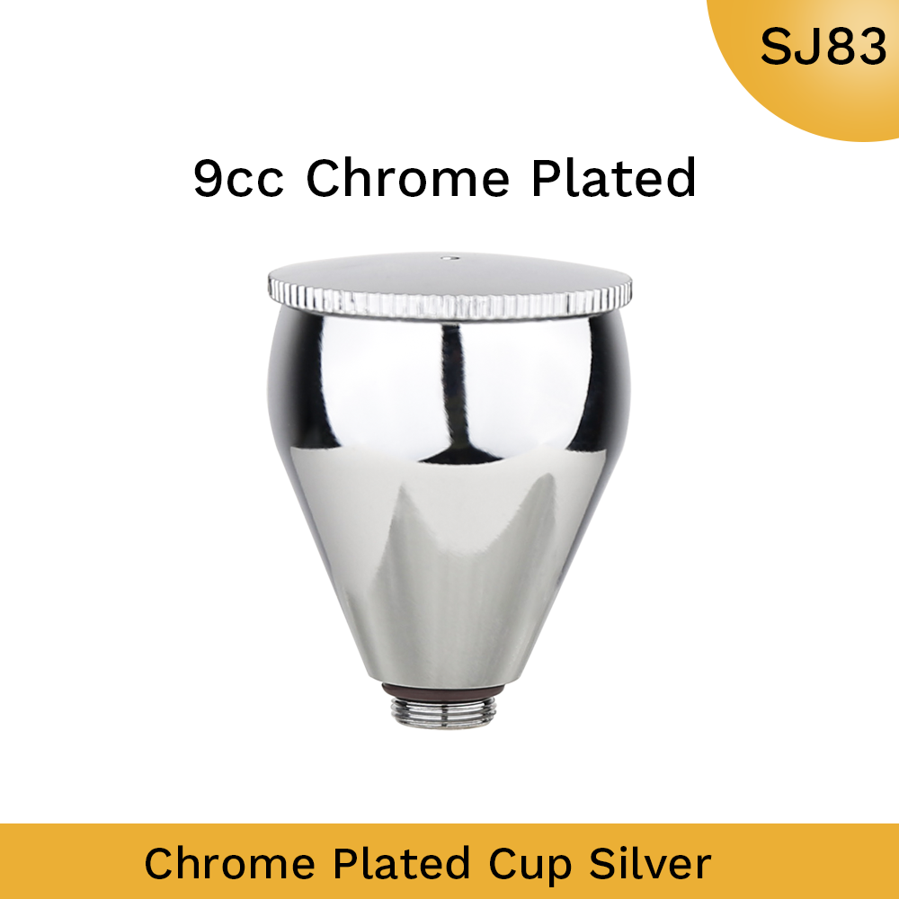 The 9cc cup is made of metal and features a chrome plating. The chrome layer remains firmly attached and does not come off easily. Additionally, the chrome plating makes it easy to clean the cup.