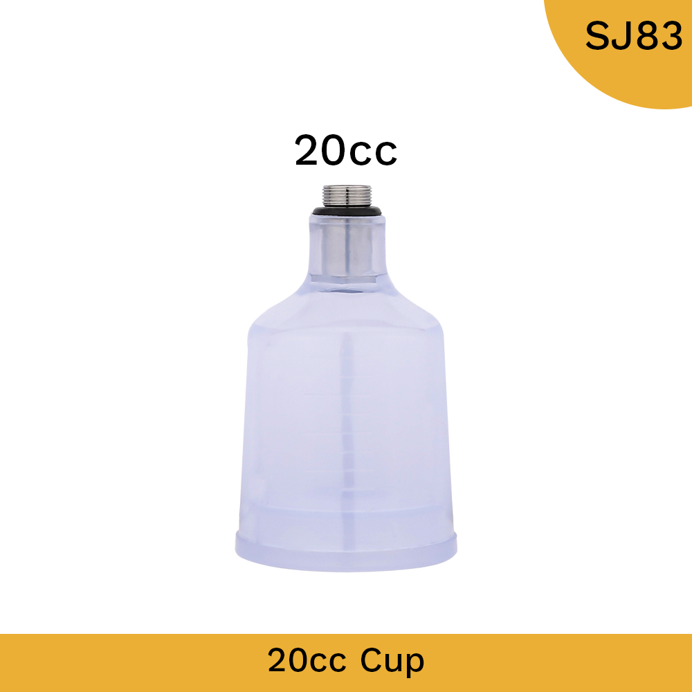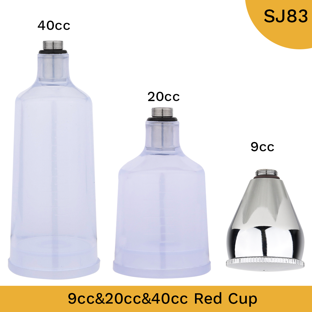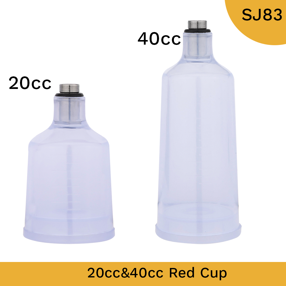 Three detachable cups available with capacities of 2cc, 9cc, 20cc, and 40cc.