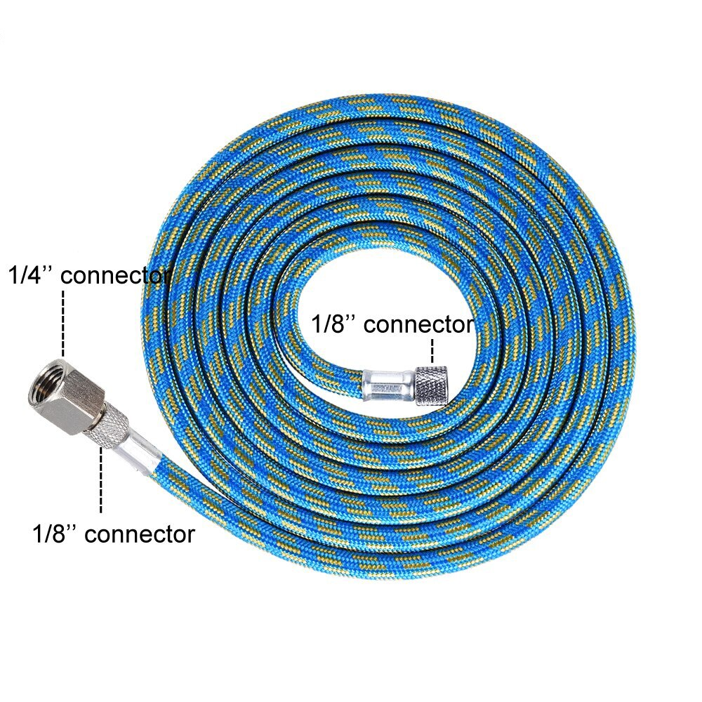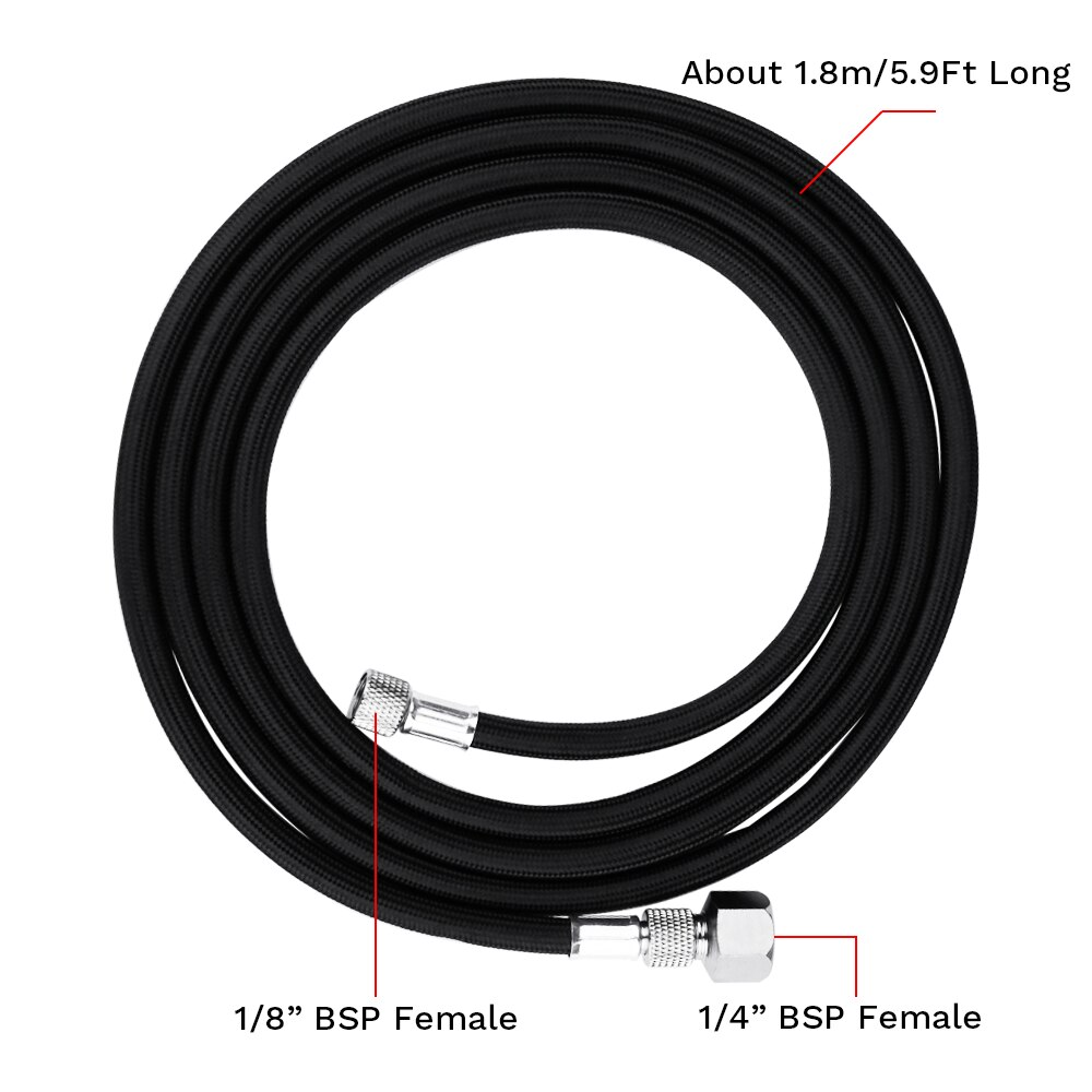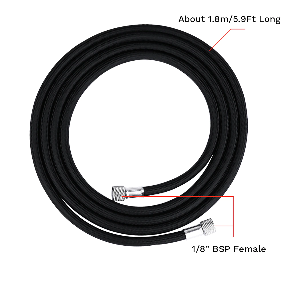 Used for connecting an airbrush to an air source, such as an air compressor or a can of compressed air. The term "nylon braided" indicates that the hose is constructed with a nylon material and features a braided design for added durability and flexibility.
