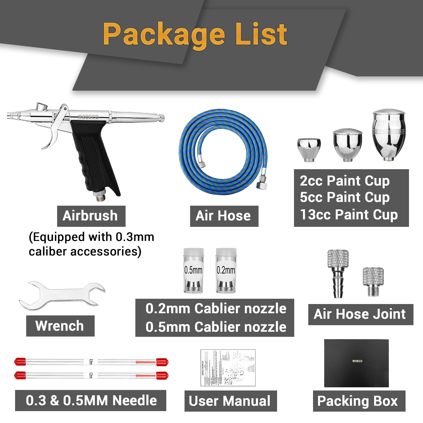 The kit includes three interchangeable head system tips with different nozzle sizes: 0.2mm, 0.3mm, and 0.5mm. These tips enable users to achieve different levels of detail, fine lines, and medium spray effects, depending on their specific requirements. This versatility is beneficial when working on projects that demand various levels of precision.