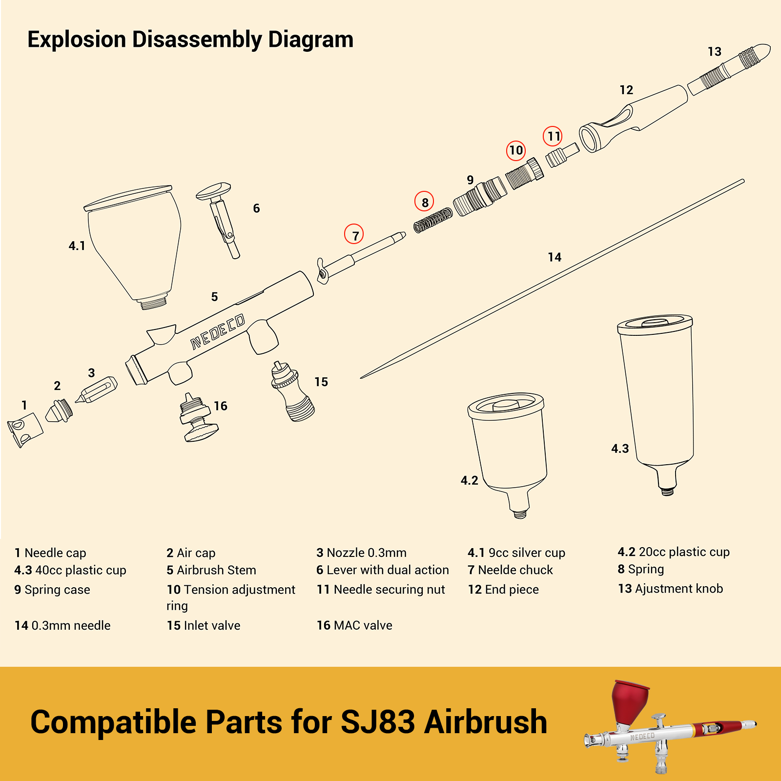 Includes spring, needle chucking guide, needle lock nut, and tension adjustment ring for the SJ83 airbrush.