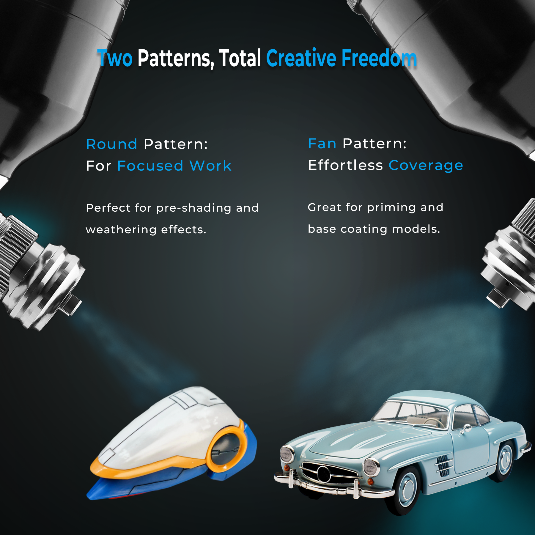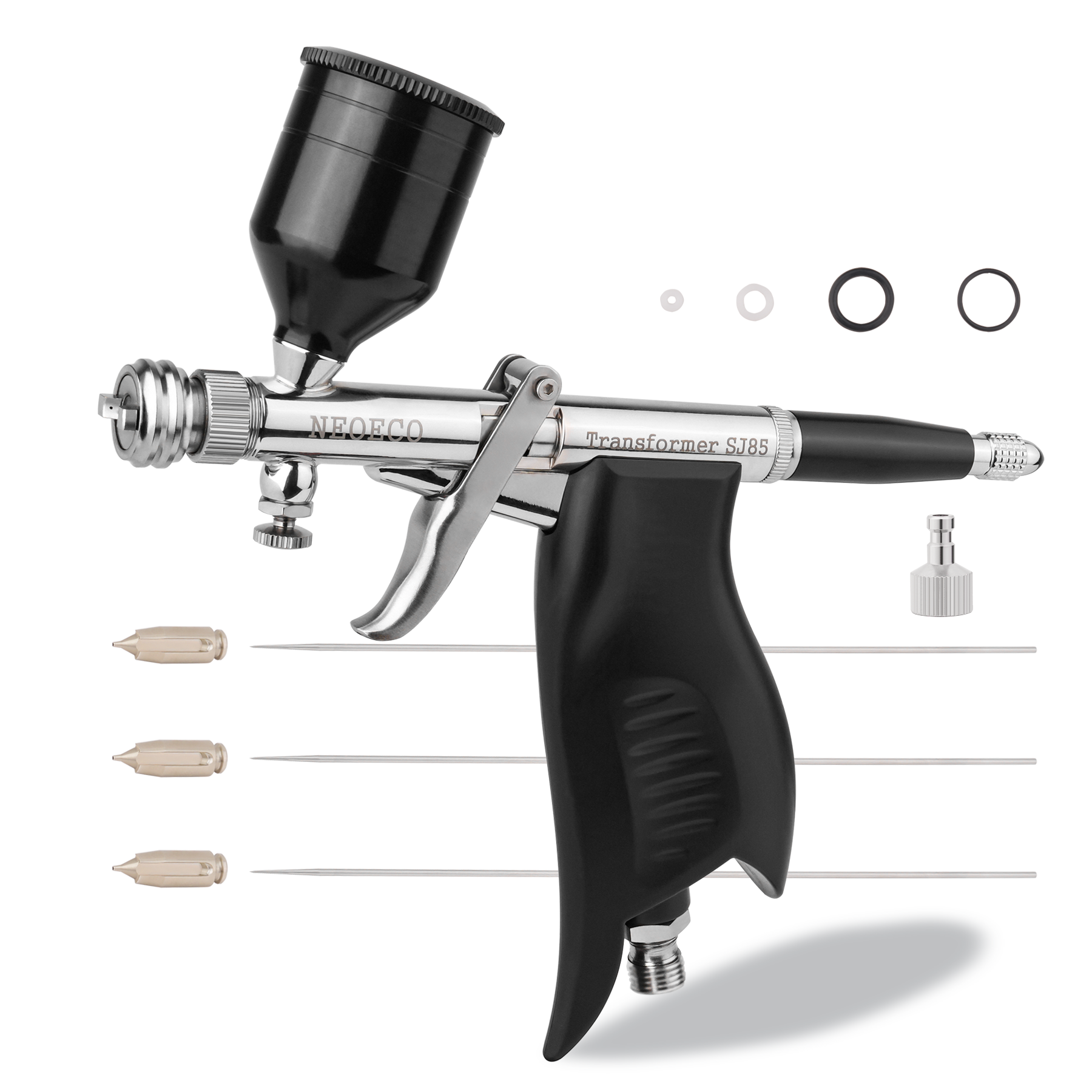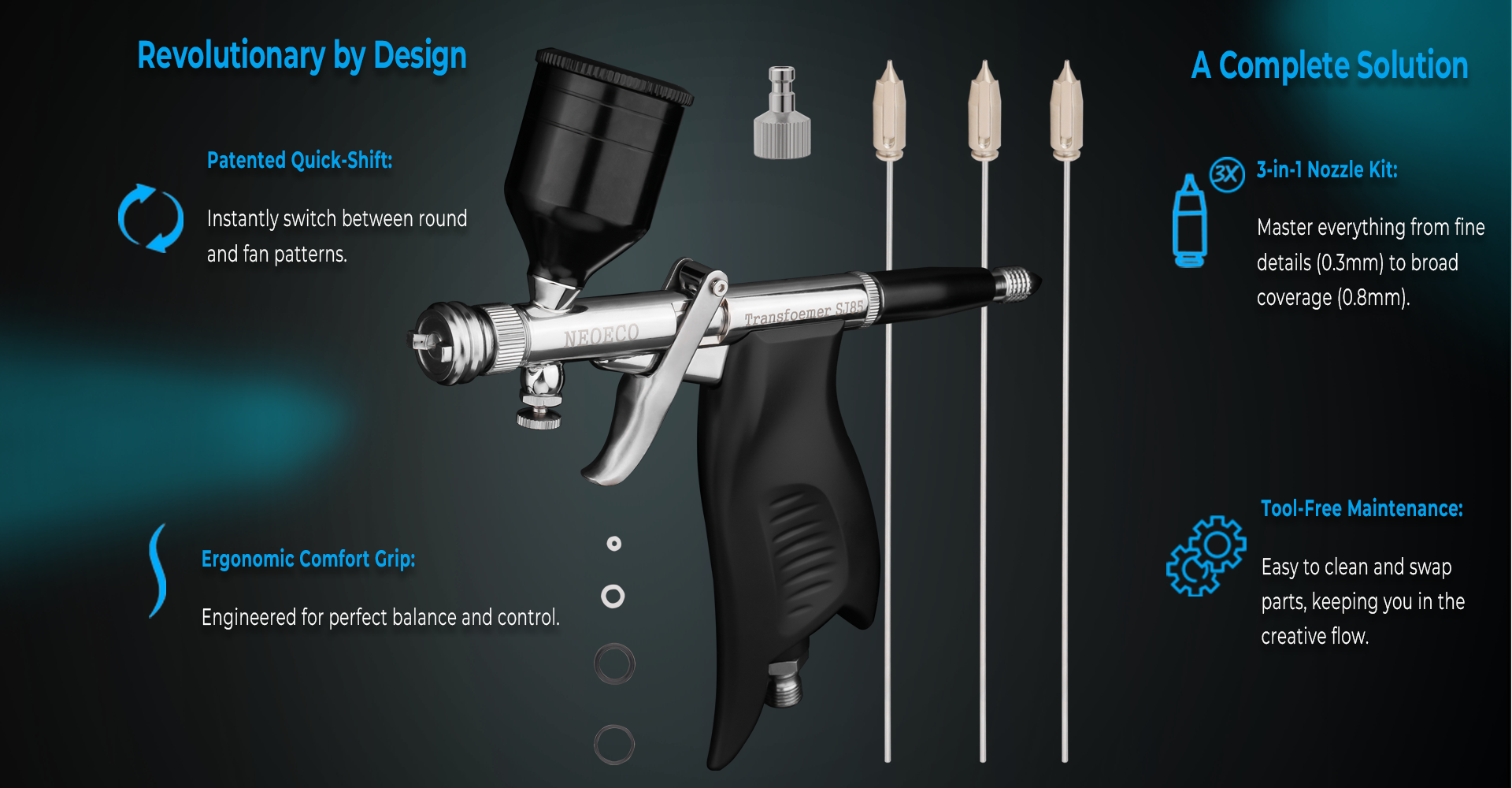 The NEOECO Transformer SJ85 is a next-generation dual-action airbrush designed for artists and modelers who demand comfort, precision, and speed. Featuring a patented 1-Second Quick-Shift system, it lets you switch between fan and round spray patterns instantly—no tools, no downtime. Its ergonomic extended grip provides unmatched comfort for long sessions, while the drop-in self-centering nozzle makes cleaning and maintenance effortless. Equipped with 0.3 mm, 0.5 mm, and 0.8 mm nozzle kits, the SJ85 delivers flawless performance for everything from fine miniature detailing to high-flow base coating. Lightweight yet perfectly balanced, this is your ultimate all-in-one airbrush system for any creative challenge.