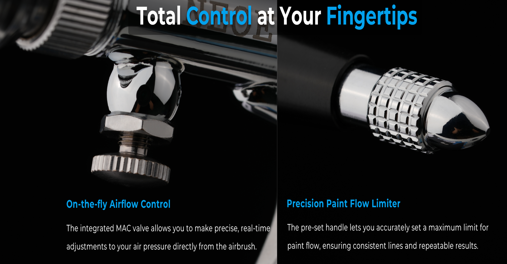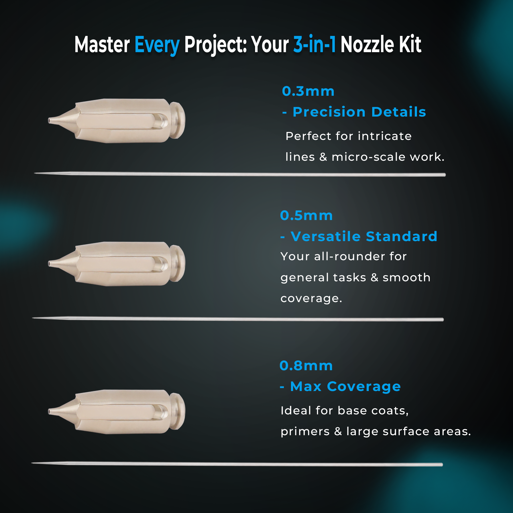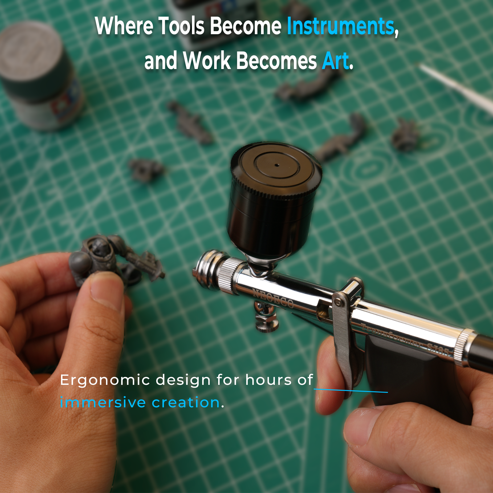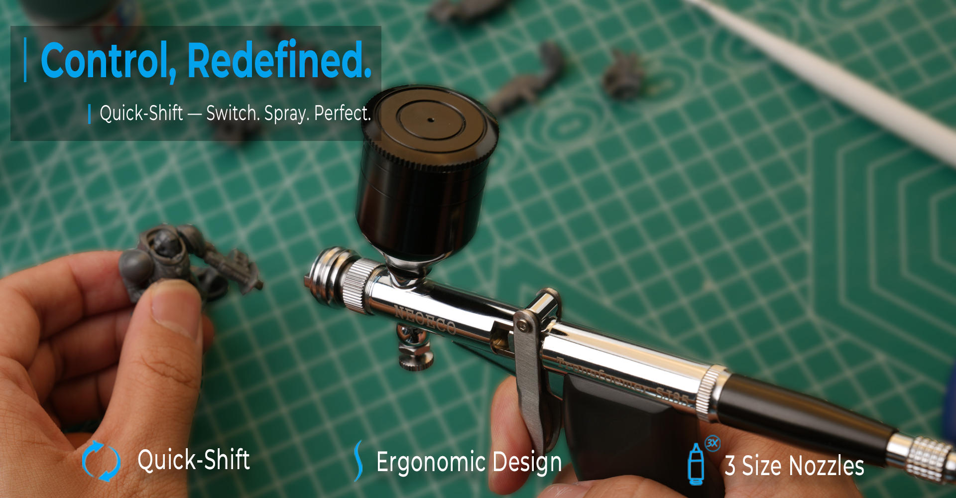 The NEOECO Transformer SJ85 is a next-generation dual-action airbrush designed for artists and modelers who demand comfort, precision, and speed. Featuring a patented 1-Second Quick-Shift system, it lets you switch between fan and round spray patterns instantly—no tools, no downtime. Its ergonomic extended grip provides unmatched comfort for long sessions, while the drop-in self-centering nozzle makes cleaning and maintenance effortless. Equipped with 0.3 mm, 0.5 mm, and 0.8 mm nozzle kits, the SJ85 delivers flawless performance for everything from fine miniature detailing to high-flow base coating. Lightweight yet perfectly balanced, this is your ultimate all-in-one airbrush system for any creative challenge.
